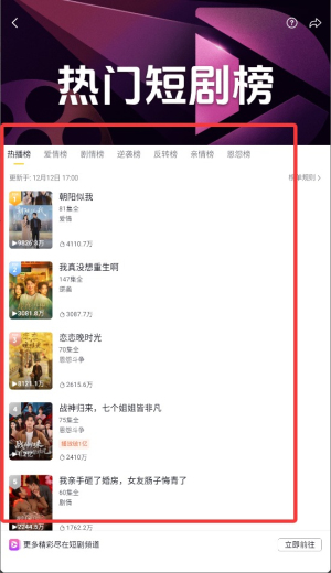 3、进入短剧页面后,点击“榜单”或“热门榜单”功能,即可查看当前流行的短剧排行。