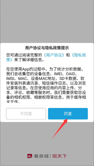 1、首次启动应用时,系统会显示用户协议和隐私政策,阅读后点击同意按钮进入主界面。
