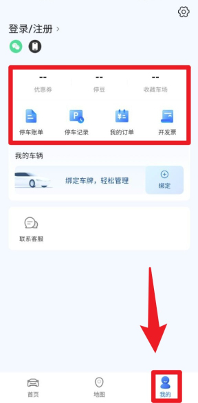 4. 点击底部“我的”进入个人中心,可管理停车账单、订单、车牌绑定及常用车场等功能模块。