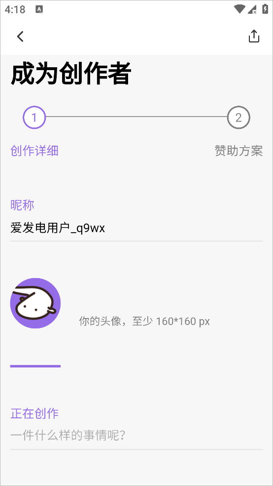 2、进入创作者页面后填写提交照片的详细信息,填写完后点击下一步在进行填写赞助方案即可完成,成为创作者