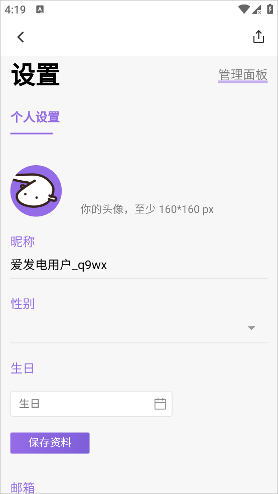 3、进入设置页面就可以更换头像和用户名啦,头像要求至少160*160px,还可以修改生日、性别、邮箱等个人信息