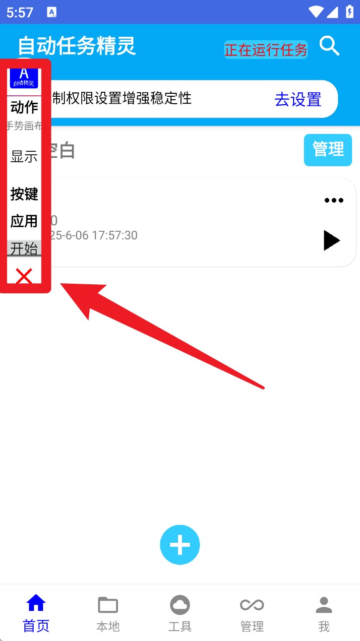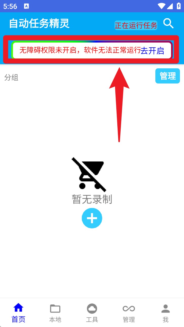 1. 进入自动任务精灵首页时,若弹出“无障碍权限未启用”提示,点击右侧“去开启”按钮进入设置。