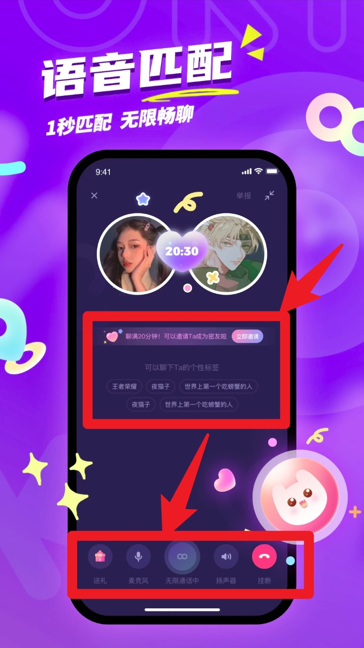 1. 支持 1v1 语音匹配,系统自动分配高契合对象,一秒开麦不冷场,破冰毫无压力。