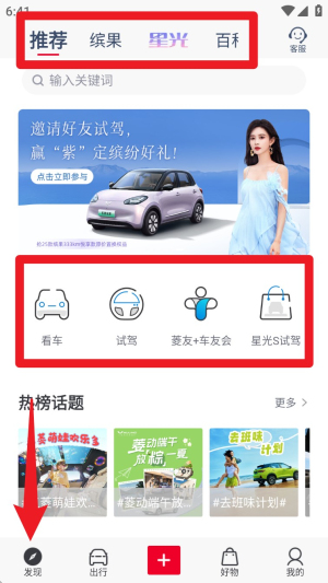 1. 打开 App 进入首页推荐页,可点击“看车”“试驾”等图标预约试驾或参与车友活动。