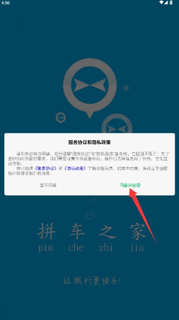 1、打开应用后仔细阅读服务协议和隐私政策,确认后点击同意并接受按钮进入。