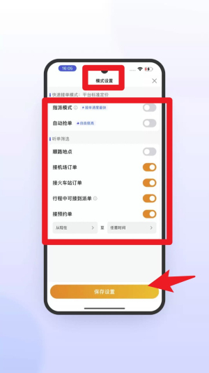 3. 在“模式设置”中可切换自动抢单、顺路接单、接机接火车单等功能,并保存接单偏好。