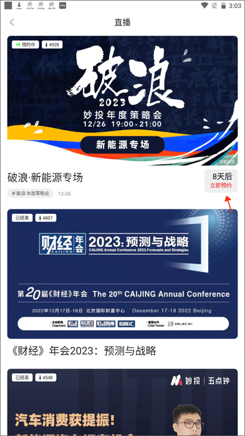 2、选择想看的直播点击立即预约