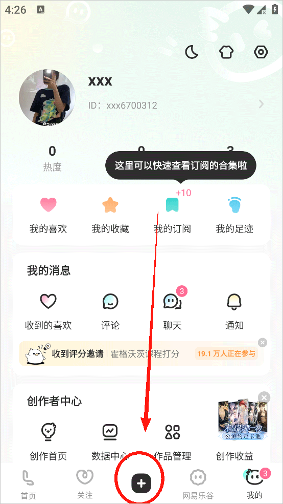 4、如果想要发布作品的话点击中间的加号