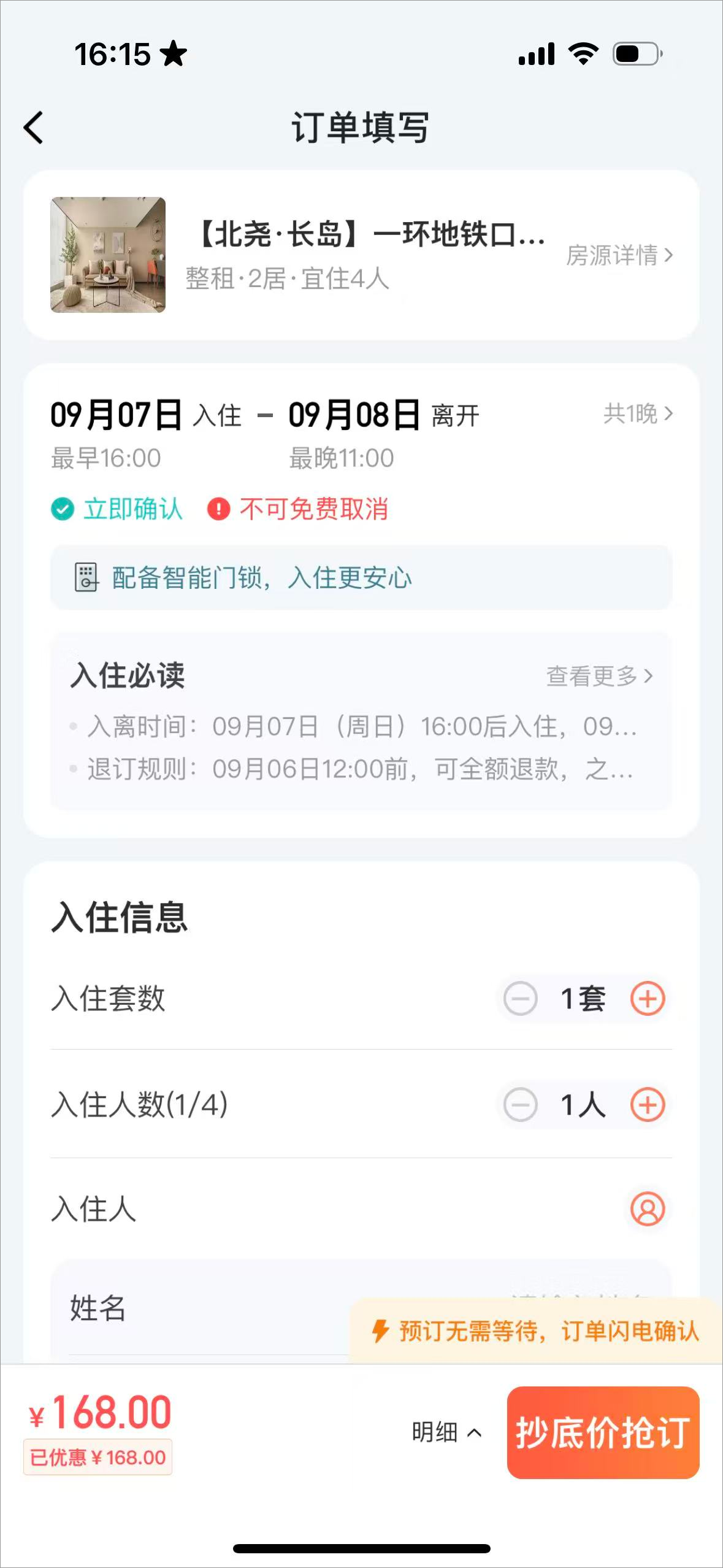 5、填写完入住信息付款即可预定房间