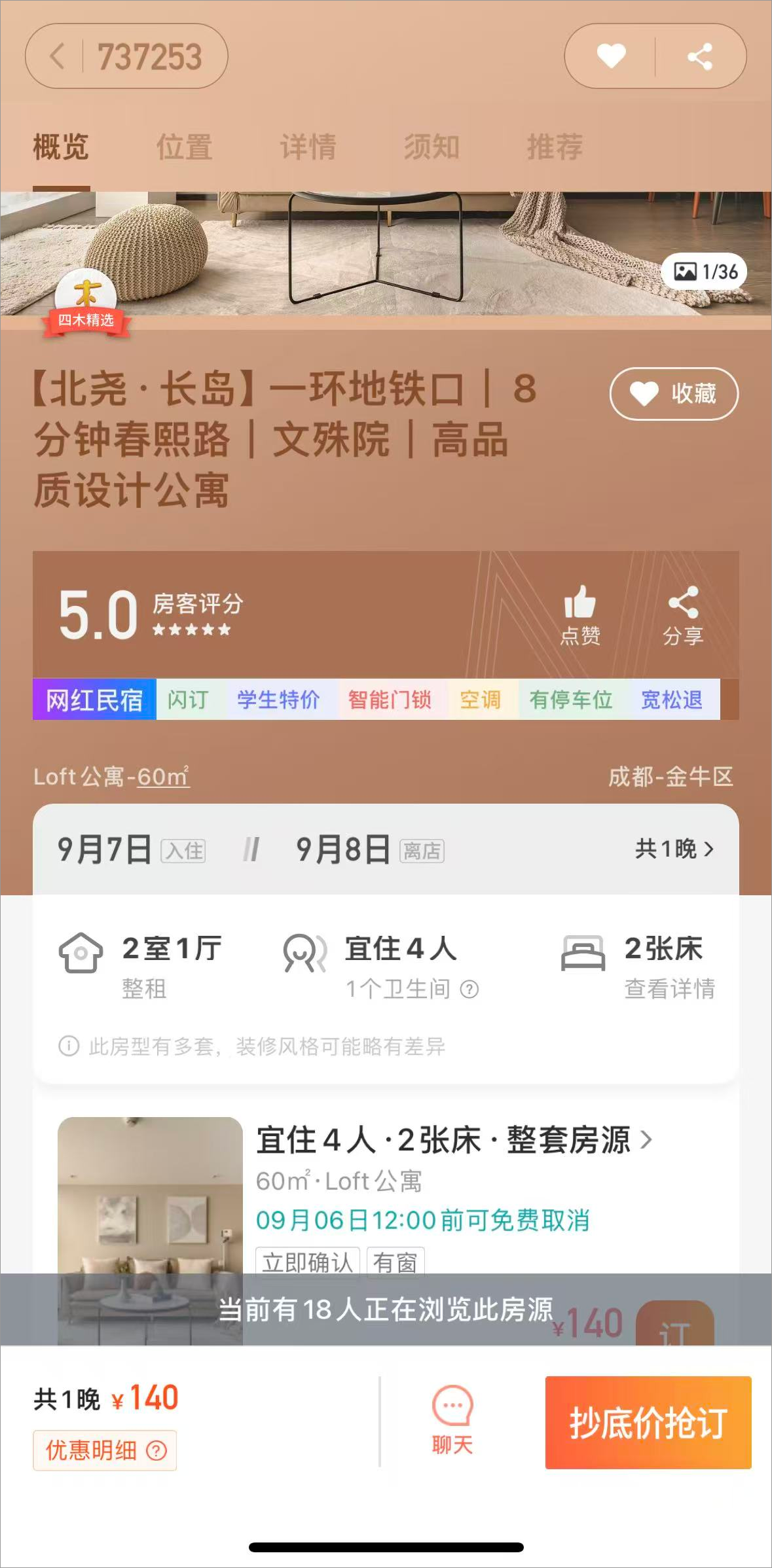 4、点击民宿后可以查看民宿的介绍、设施、评价等再点击右下角的抢订