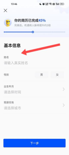 2、简历编辑页通过进度条引导完善基本信息,完整简历可显著提升职位匹配成功率。
