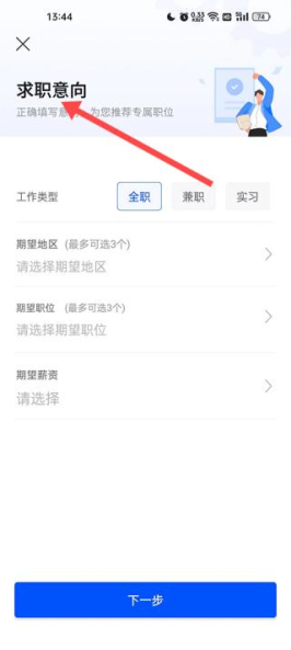 1、在求职意向页面选择工作类型与期望地区,设定薪资范围后系统将智能推送匹配岗位。