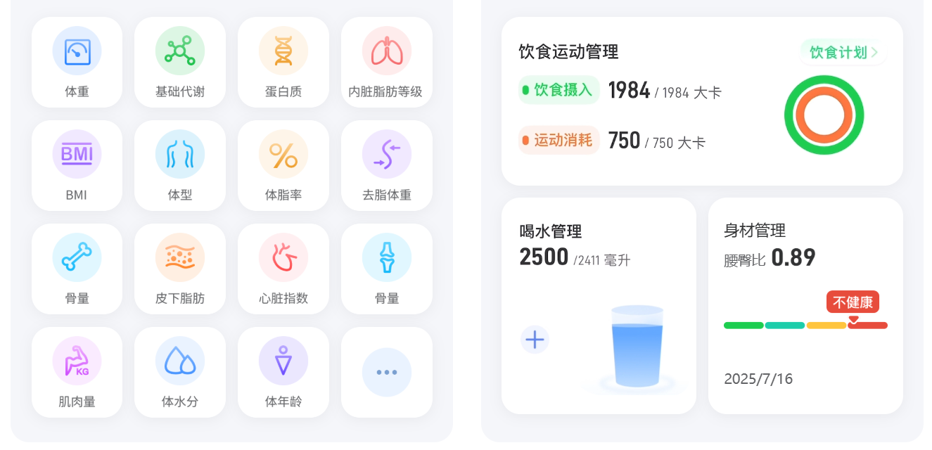 支持多账号添加多个家人,青少年专业测脂及肥胖管理、孕妇模式、老人慢病监测(血压、血糖、血氧),异地也能同步关注家人健康。