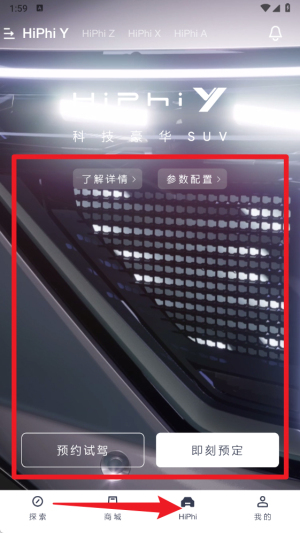 4、在【HiPhi】页,选择车型查看“了解详情”“参数配置”,并可一键“预约试驾”或“即刻预定”。