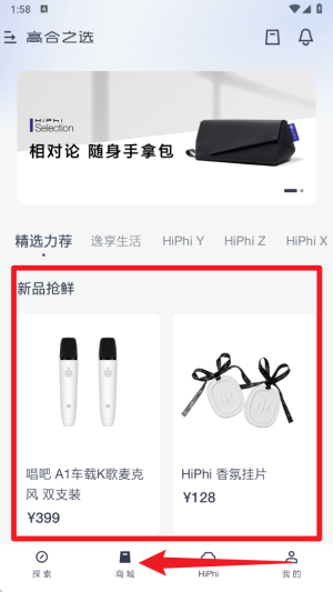 3、进入【商城】,在“精选力荐 / 新品抢鲜”等区域可查看并购买周边商品,如“唱吧A1车载K歌麦克风”“HiPhi香氛挂片”等。