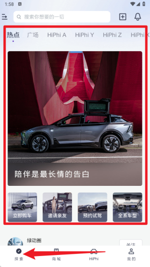 2、在【探索】页,可浏览“热点、广场、HiPhi A / HiPhi Y / HiPhi Z / HiPhi X”等栏目;下方提供“立即购车、邀请亲友、预约试驾、全系车型”等快捷入口。