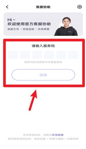 2、 打开客服协助界面后,输入由客服提供的六位服务码,确认无误后点击下方“连接”按钮。