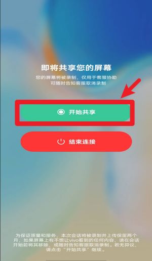 1、打开APP,连接成功后会出现“开始共享”画面,点击绿色按钮确认共享屏幕,开始远程协助操作。