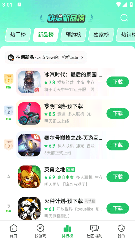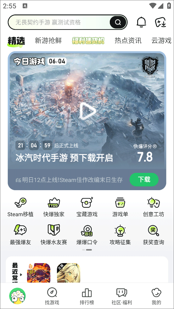 1、首页会有新游戏,以及即将上线的游戏预约或者下载,方便大家看到实时上线的新游戏,往下滑会有新鲜推荐的游戏,都是榜单排名较前的热玩游戏