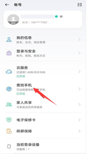 2、进入账户详情页面后,浏览并点击“查找手机”或类似的安全服务功能入口。