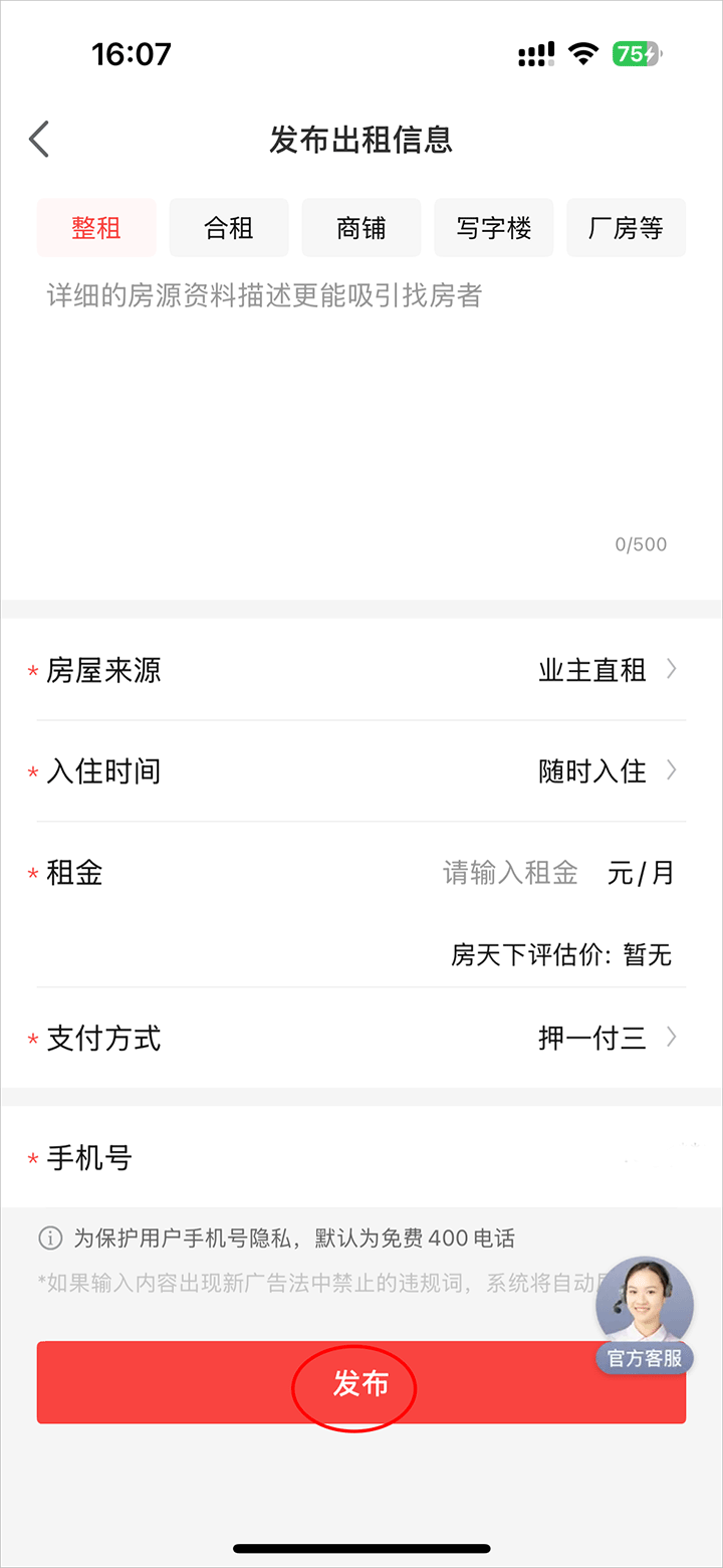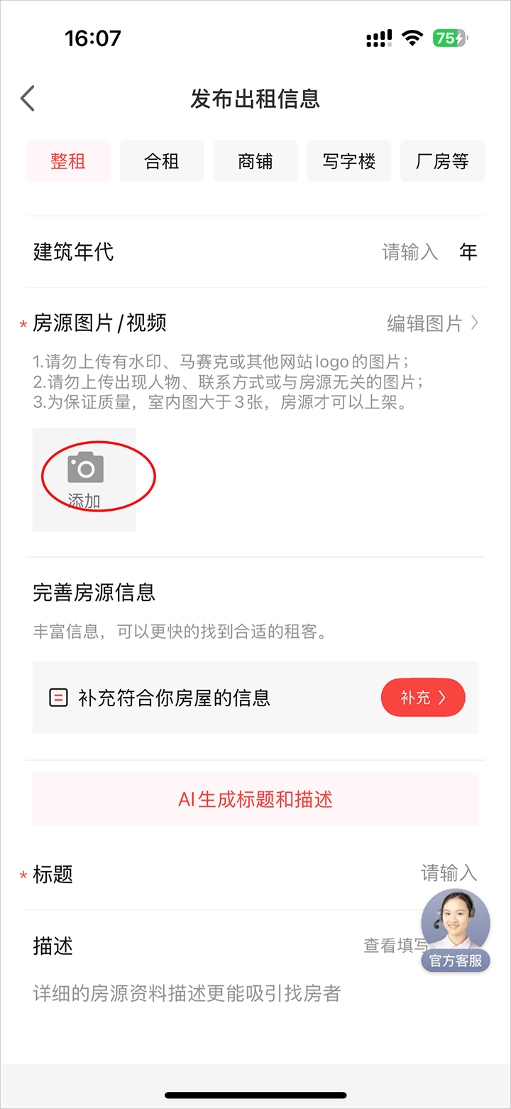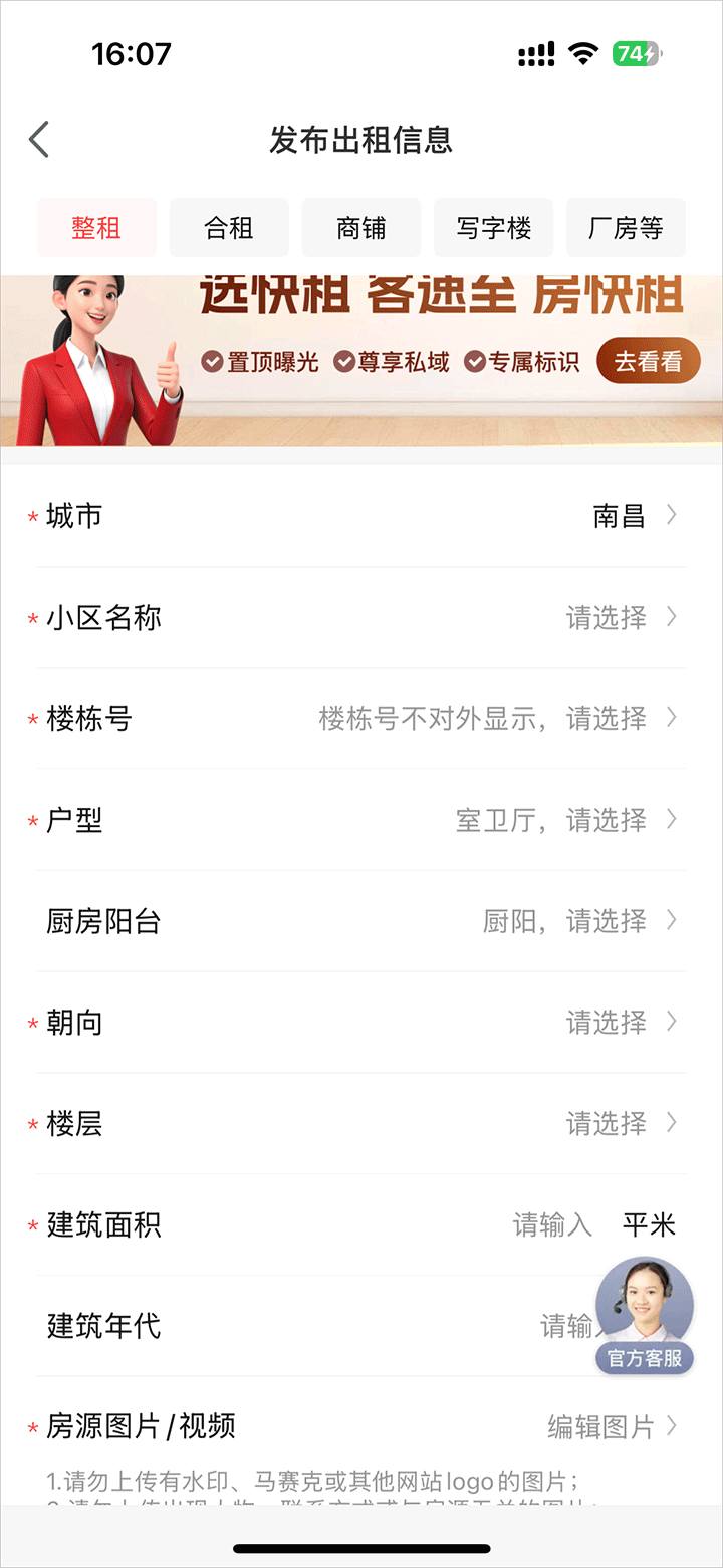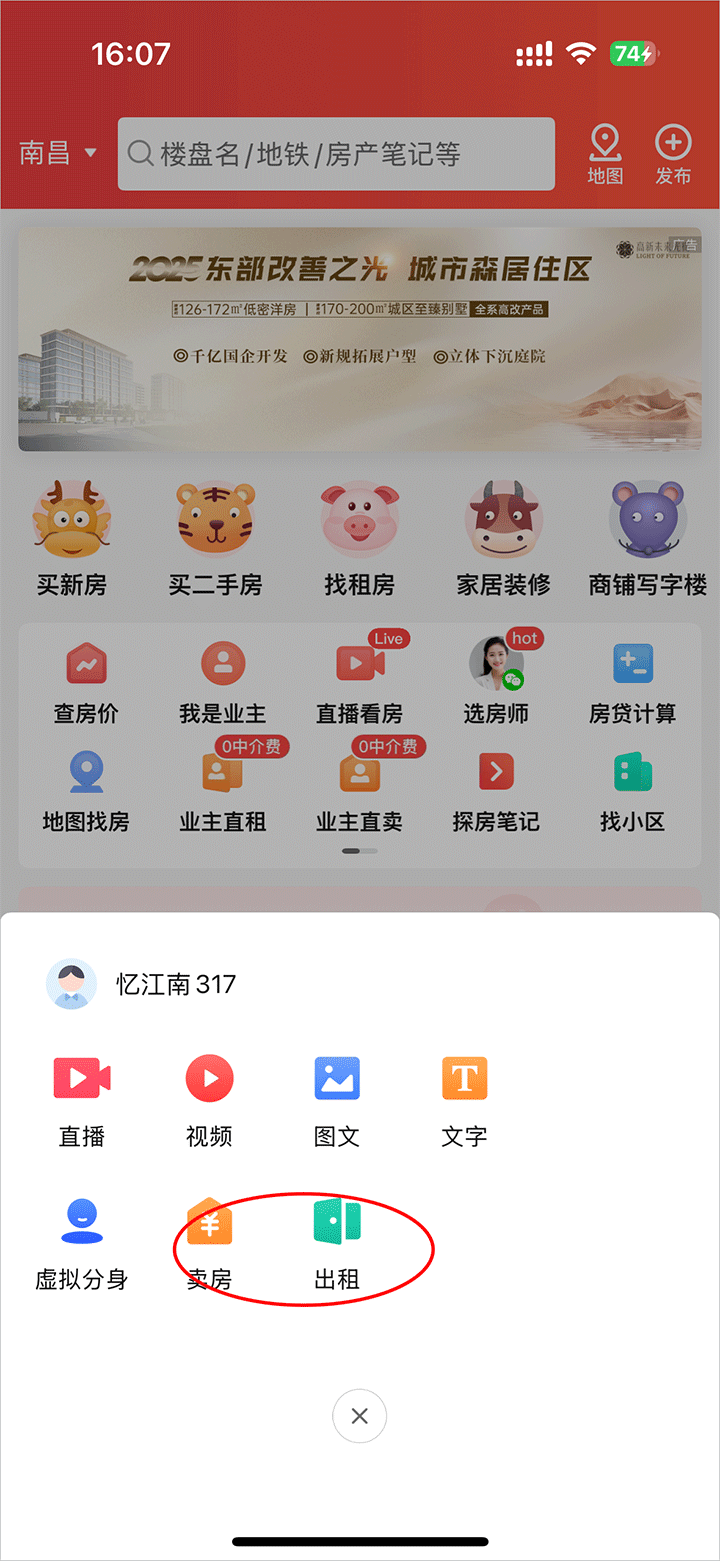 2、弹出窗口选择卖房还是出租房源,小编以出租为例