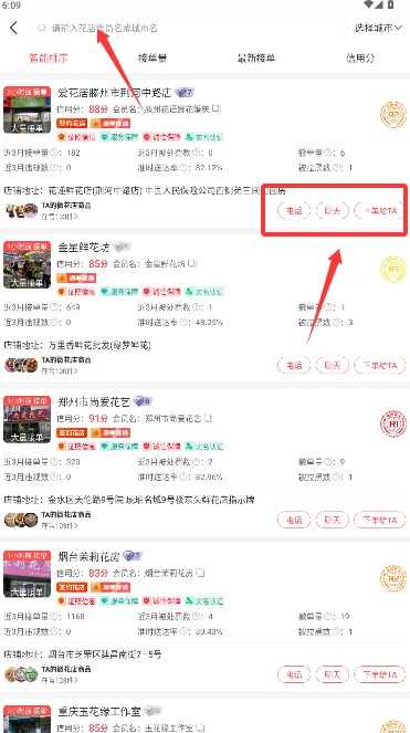 4、输入目标城市或花店名称,从列表中选择合适商家进行沟通并完成订单提交。