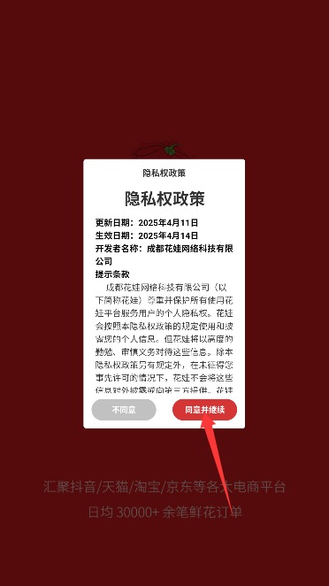 1、打开应用后仔细阅读服务协议和隐私政策,确认后点击同意并继续按钮进入。
