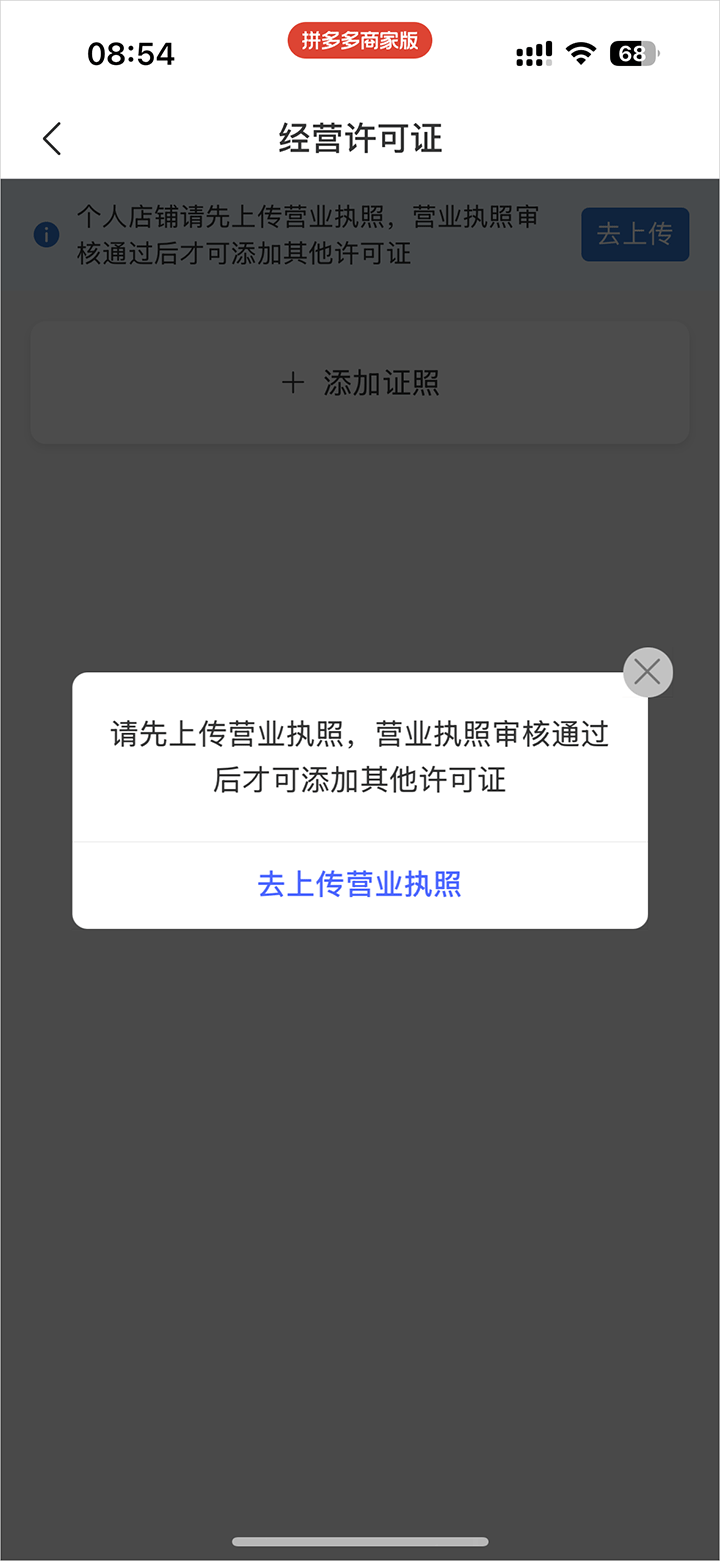 3、会跳转至经营许可证页面,你需要点击【添加证照】。