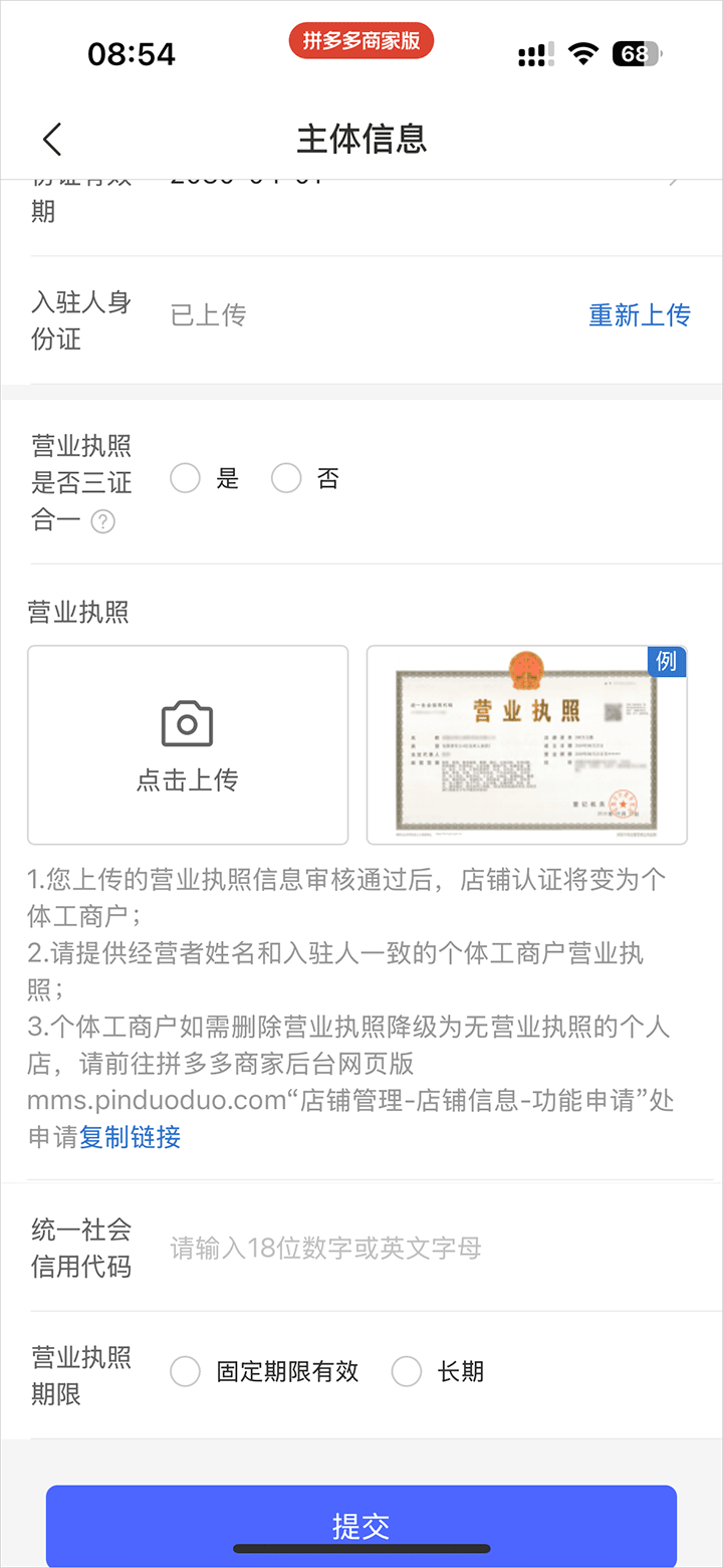 4、上传营业执照后填写完整信息即可提交,提交成功,就可在商号页-商品管理-出售中看到该商品。