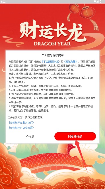 1、打开应用后仔细阅读服务协议和隐私政策,确认后点击同意并继续按钮进入。