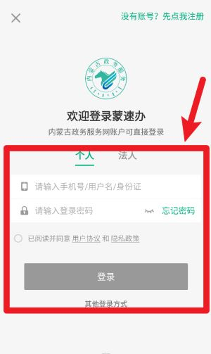 1、打开app,在登录界面中选择“个人”或“法人”,输入手机号与密码并勾选协议后点击登录即可进入系统。