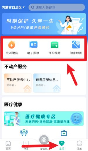4、进入“生活”栏目后,可在上方功能栏中选择生活缴费、预约挂号等服务,便于办理生活相关事务。