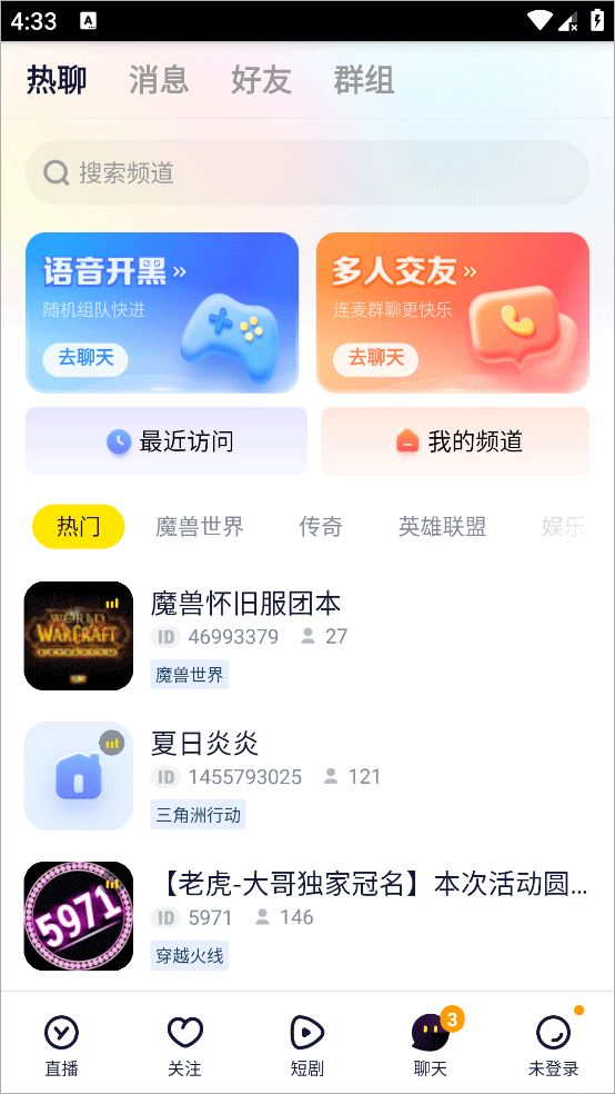 4、聊天功能可以进行随机语音开黑,或者是多人连麦交友
