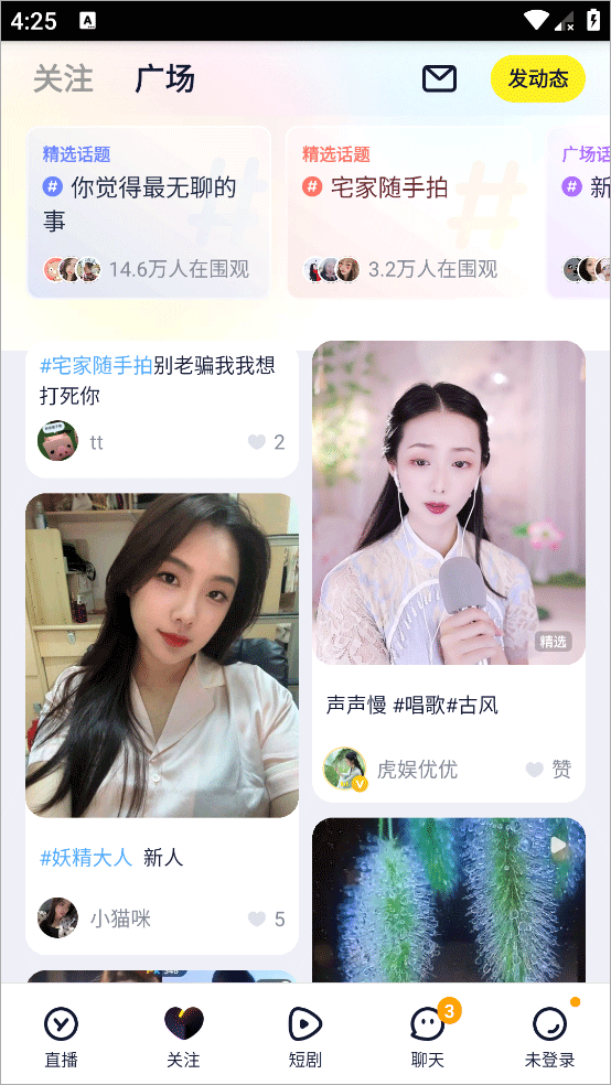 2、关注页面可以快速进入关注主播的直播间,还可以查看广场热门话题跟其他玩家进行互动,也可以发布自己的动态
