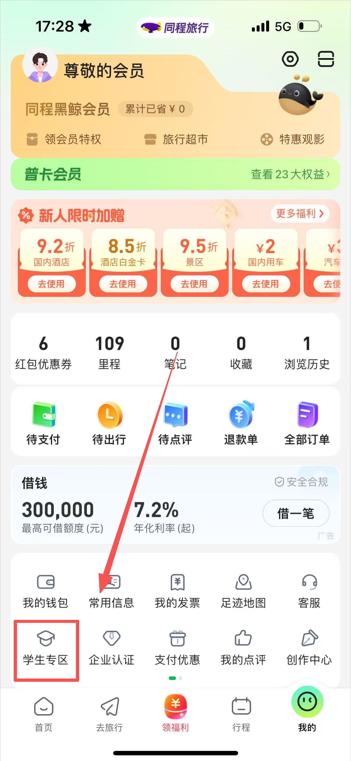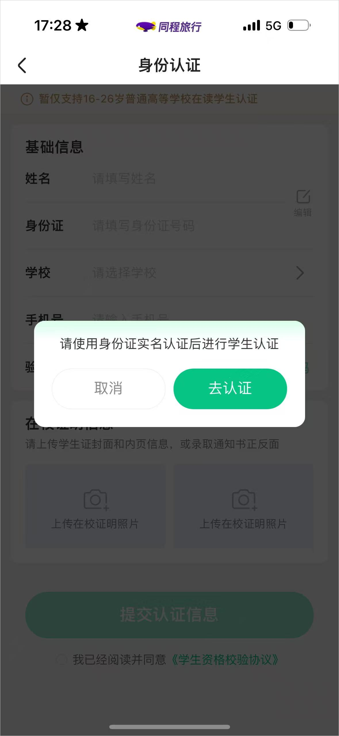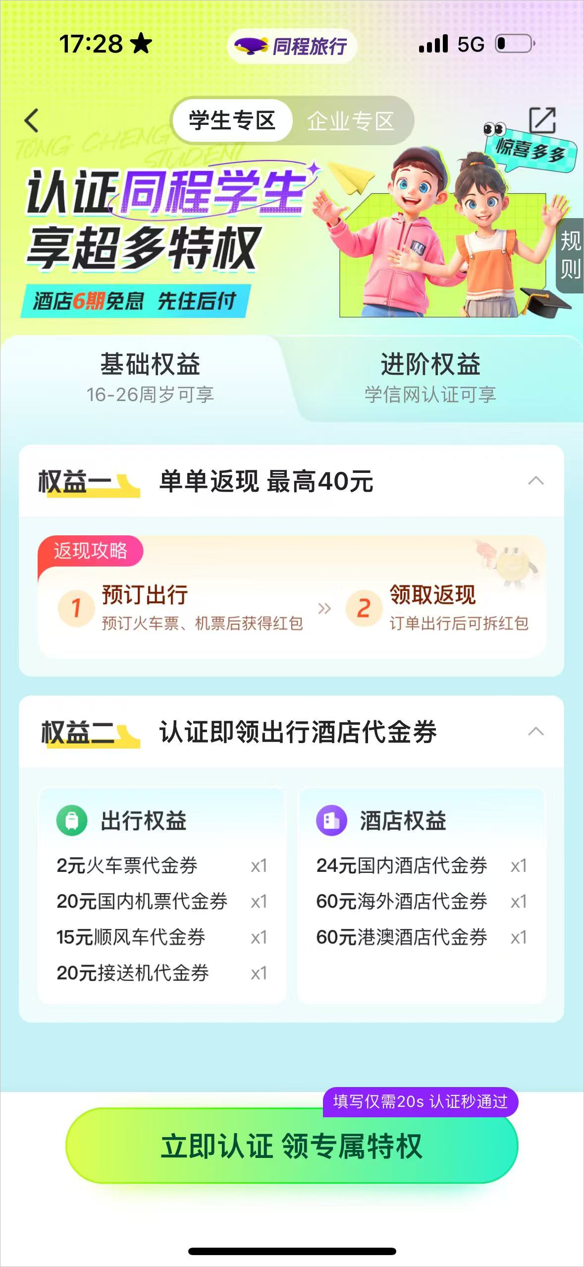 3、然后在同程学生权益的页面点击最下方的“立即认证”;