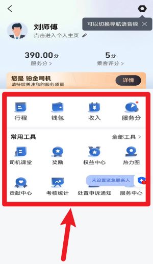 4、个人主页整合了行程、钱包、服务分等功能,同时提供考核统计、投诉处理等常用服务入口,方便全面管理。