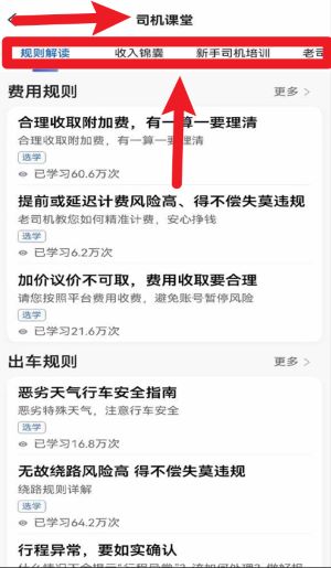 3、点击“司机课堂”可进入规则解读、收入锦囊与新手培训等栏目,帮助司机快速掌握平台运营规则。