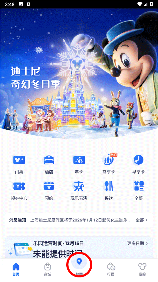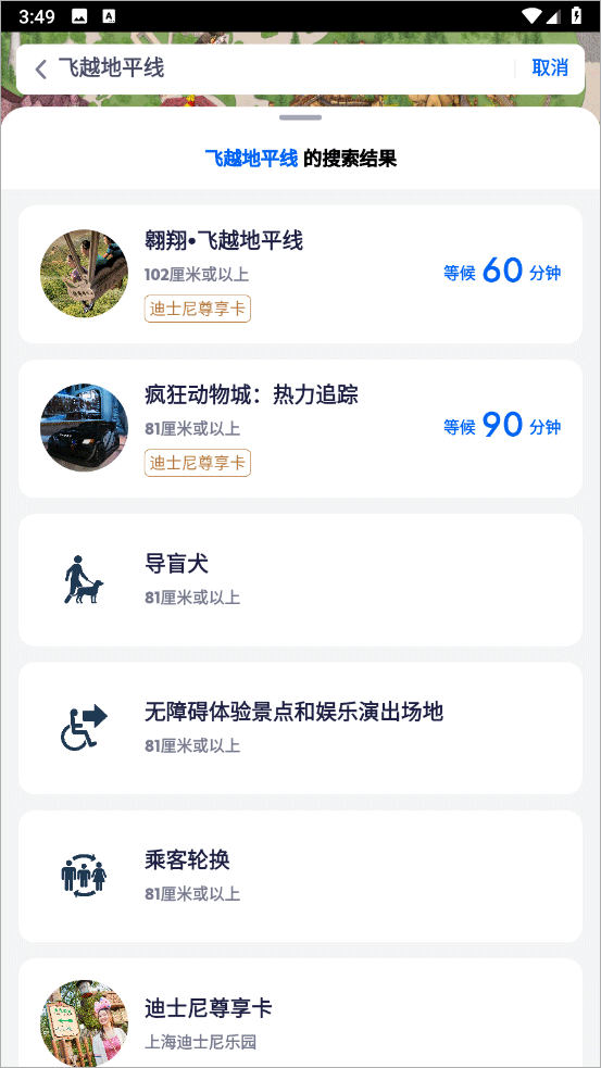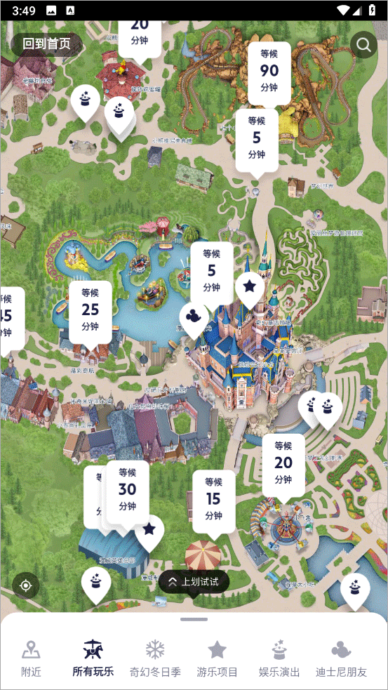 7、查看等待时间及演出安排:快速查看景点及娱乐演出预计等待时间以及当前正在发放的快速通行证的返回景点时间;查看花车巡游及娱乐演出时间。