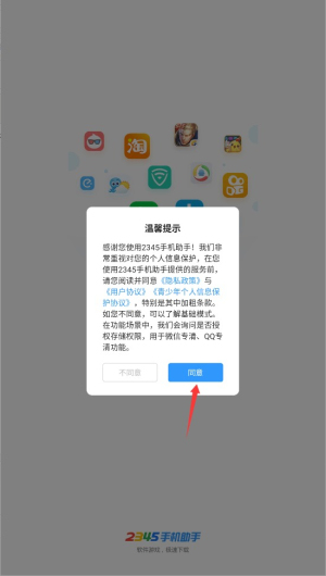 1、首次启动应用时,系统会显示用户协议和隐私政策,阅读后点击同意按钮进入主界面。