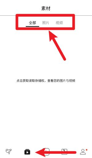 3、进入素材页面后,根据分类选择“全部”、“照片”或“视频”选项,授权读取本地存储即可查看对应内容。