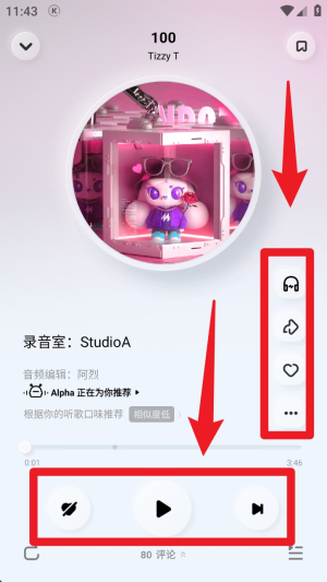 4. 进入播放页后可操作暂停、切歌、收藏、评论等操作,右侧还提供音乐电台和分享等扩展功能入口。