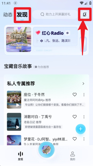 1. 进入酷狗App首页后点击下方导航栏中的「发现」标签,再点右上角的识曲图标进入听歌识曲功能页。
