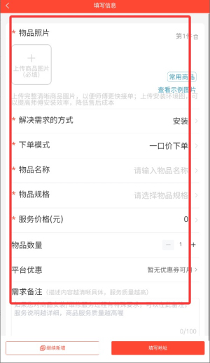 3、根据需求选择装修设计或维修安装等服务类型,进入详细信息填写页面。