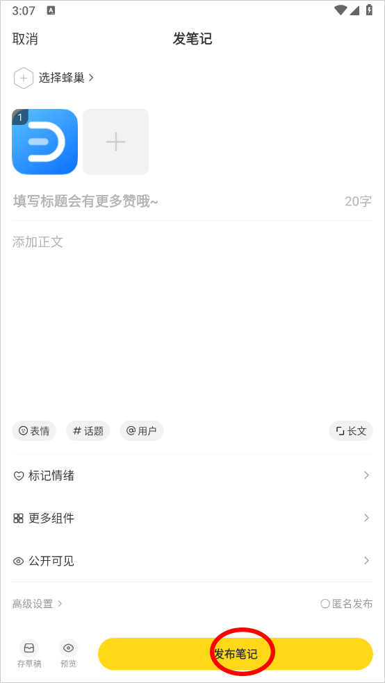 4、选好后填写内容点击发布笔记即可