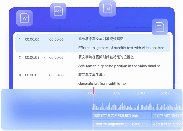 将字幕文稿与视频自动音文对齐,支持中文 /英语 /日语字幕文稿自动匹配到音频并生成时间轴,实现自动打轴!