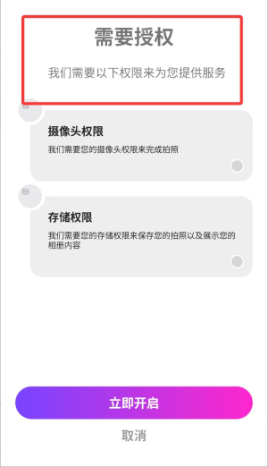 4、根据提示完成相机使用权限授权,即可开始使用全部拍摄功能与特效工具。