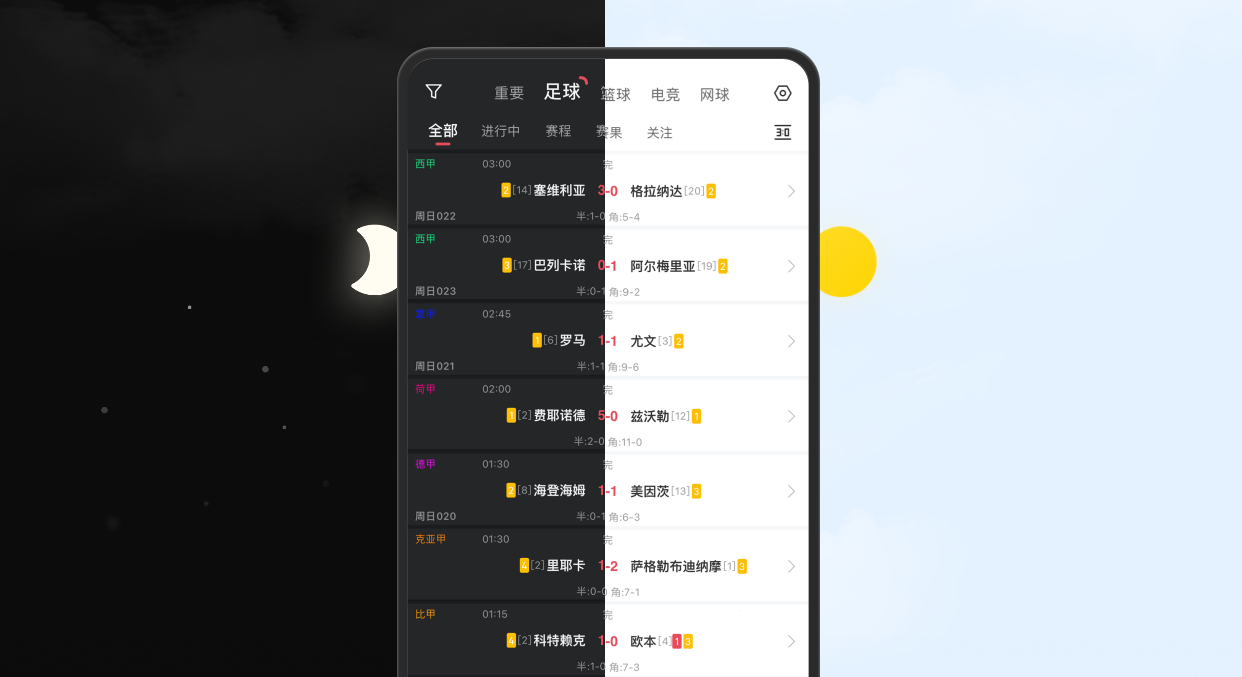 更贴心更个性化的主题切换,在看球的同时适当保护眼睛