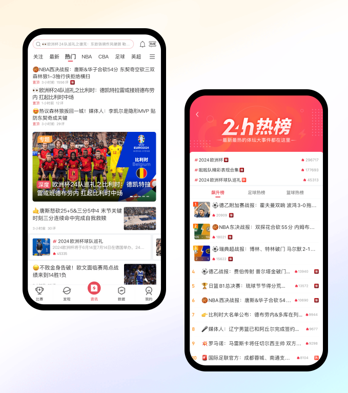 各类频道,探索优质内容。24小时热榜,追踪全球体育资讯热点事件,一触即达。精彩话题,看球聊心得,发现更多同好。