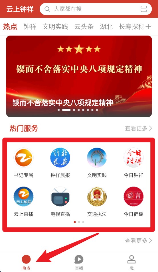 1、点击底部“热点”图标,可进入热点页面,浏览最新时政宣传内容及便民服务入口。
