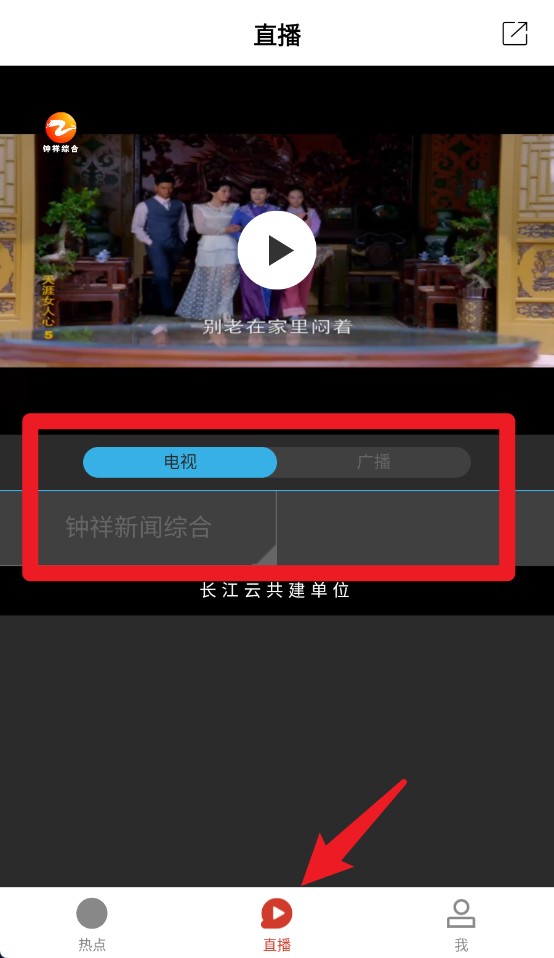 3、点击底部“直播”按钮,选择“电视”或“广播”即可观看钟祥本地电视节目或收听广播。